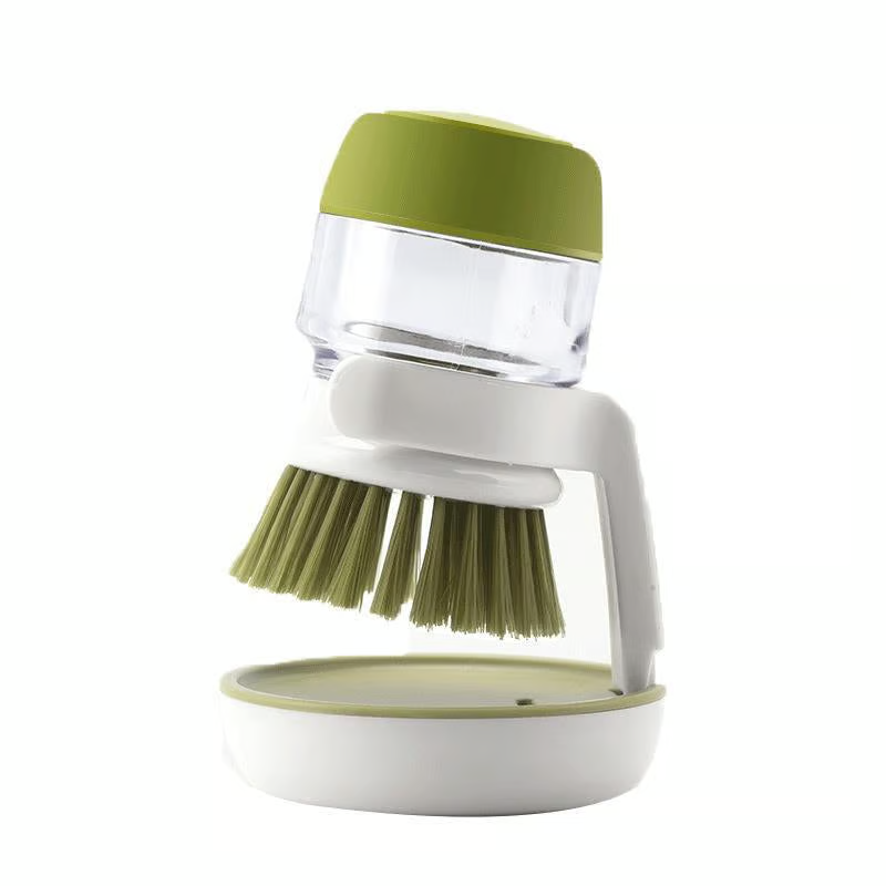 SOFT BRISTLES: This cleaning press brush is designed for scrubbing pots and pans, the soft bristles are gentle on your hands and the soap function cleans dishes easily.